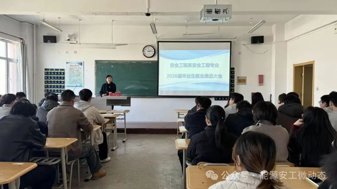 为深入贯彻落实高校毕业生就业创业工作部署,切实打通毕业生就业服务“最后一公里”,精准助力2026届毕业生平稳迈向职场,3月18日,安全工程系在1404教室隆重召开2026届毕业生就业推进会。参加本次会议的有系主任李鹏,系党总支副书记张美红,系副主任赵国飞,专职辅导员卢国菊老师,毕业班辅导员王小丽老师和李丹老师,以及2026届全体毕业生,共同聚焦就业难题、明晰发展方向、提振求职信心。