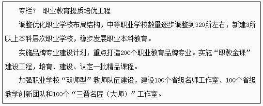 改善高等职业学校办学条件,整体提升办学质量。聚焦关键领域、重点行业、重点区域,调整优化高等职业学校布局结构。支持符合条件的优质高等职业学校整合资源组建本科层次职业学校,稳步发展职业本科教育。以省级高水平中等职业学校为基础,开展五年制高等职业教育试点。建立专业设置、办学规模动态调整机制。支持4所入列国家“双高计划”高职院校推进建设项目,发挥示范引领作用。实施省级“双高计划”,立项建设10所高水平高职学校和高水平专业群,带动高等职业教育提档升级。