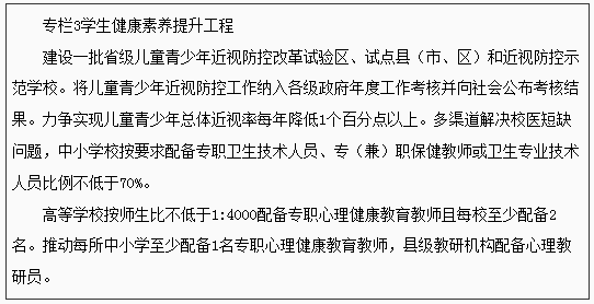 完善以课堂教育为主渠道、主题教育为重要载体、日常教育为基础的健康教育推进机制,帮助学生塑造健康心理品质、形成终身受益的健康生活方式。将儿童青少年体质健康状况、近视防控工作纳入各级政府绩效考核,健全协同工作机制。健全学生体质健康监测评价机制。巩固深化新冠肺炎疫情防控经验成果,全面提升应对突发公共卫生事件的治理能力、应急管理能力和师生健康护理能力。在大中小学广泛开展校园爱国卫生运动。鼓励大中小学成立健康教育管理中心,加强中小学校医务室(保健室)和高校校医院建设,鼓励多渠道解决校医短缺问题。建立学校食品安全与营养健康管理协作工作机制。针对性加强学校急救设施建设和师生急救培训。