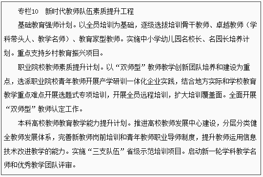 实施职业学校教师素质提升计划,优化教师队伍结构。制定“双师型”教师认定标准和符合职业学校特点的教师职称评定办法。深入推进育人方式改革,以适应职业岗位需求为导向,加强实践教学。提高职业学校教师信息化教学能力,推进信息技术与教育教学改革深度融合。实施教学方法改革创新工程,支持建设一批“课堂革命”示范项目,改进教学内容及教材管理。完善“岗课赛证”综合育人机制,持续举办职业院校技能大赛,深入实施职业技能等级证书制度,提升学生实践能力和职业素养。将新技术、新工艺、新规范、典型生产案例及时纳入课程教学内容,充实改造优化课程和专业。严格选用国家统编教材、规划教材,鼓励学校建设行业适用教材、地方特色教材、校本专业教材,建成一批活页式、工作手册式教材和融媒体特色教材。