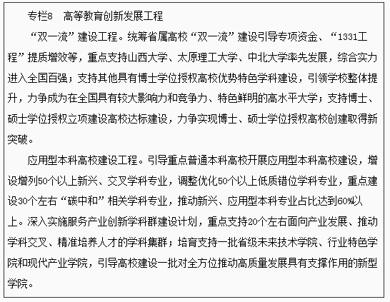 加大高等教育统筹发展力度,完善分类发展体系,推动高校办学定位更加合理、办学特色更加鲜明、优势资源更加集聚、创新生态更加优化、人才培养更加精准。加快推动“双一流”建设高校内涵式高质量发展,支持山西大学、太原理工大学、中北大学率先发展,深入推进教育部与省政府战略合作备忘录、合建山西大学,省政府与工业和信息化部共建中北大学,实施“双一流”种子学科培育工程,推动“双一流”建设取得明显成效。加强应用型本科高校建设,着力构建支撑全方位推动高质量发展的应用型本科教育体系。支持其他具有博士学位授权的高校提升基础能力,加快优势特色学科建设,力争成为在全国或行业具有较大影响力的研究应用型大学;推进未获得博士学位授权的普通本科高校面向行业产业发展需求,全面建设高水平应用型本科高校,推动教育链、人才链与产业链、创新链深度耦合。