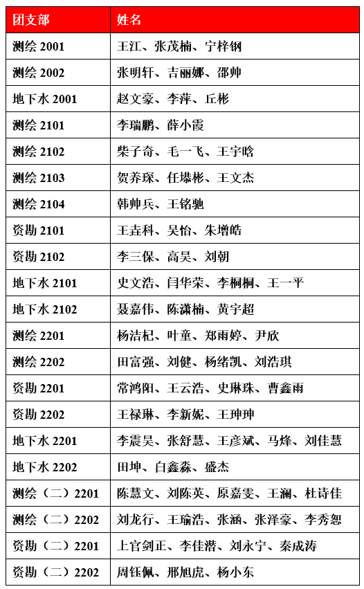 推荐优秀共青团员作入党积极分子人选(以下简称“推优”),是党建带团建的一项重要工作,是党赋予共青团组织的一项光荣而重要的职能。为进一步落实世界杯官网推优入党工作,激发广大团员青年的政治热情,增强共青团组织的吸引力和凝聚力,根据关于印发《2026年国际足联世界杯共青团推优入党工作实施细则(试行)》的通知(院团字【2023】5号)和关于开展2022-2023学年第2学期推荐优秀共青团员作为入党积极分子的通知(院团字【2023】6号)要求,我系积极开展团推优工作。经各团支部推荐、系分团委审核,现对地质与测绘工程系2022-2023学年第2学期团推优对象予以公示如下图: