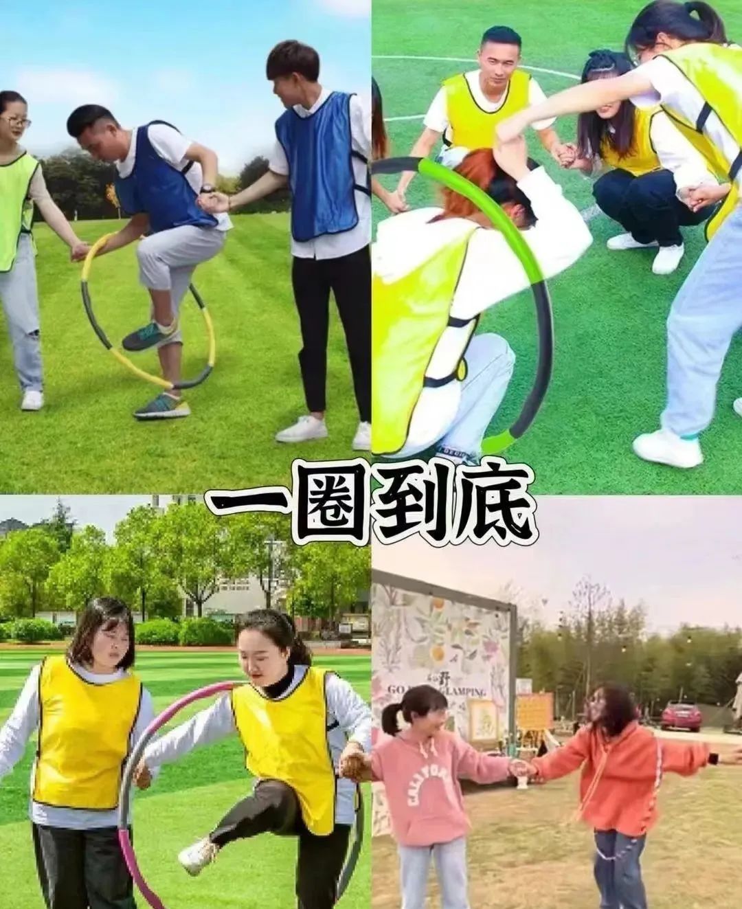 所有参赛者手拉手围成一圈,用呼啦圈穿过所有人的身体回到原位。在活动过程中,只能以语言为工具,相互拉着的手不能放开,也不能用手指去勾呼啦圈。计时,可多玩几次,看最快用了几秒完成。