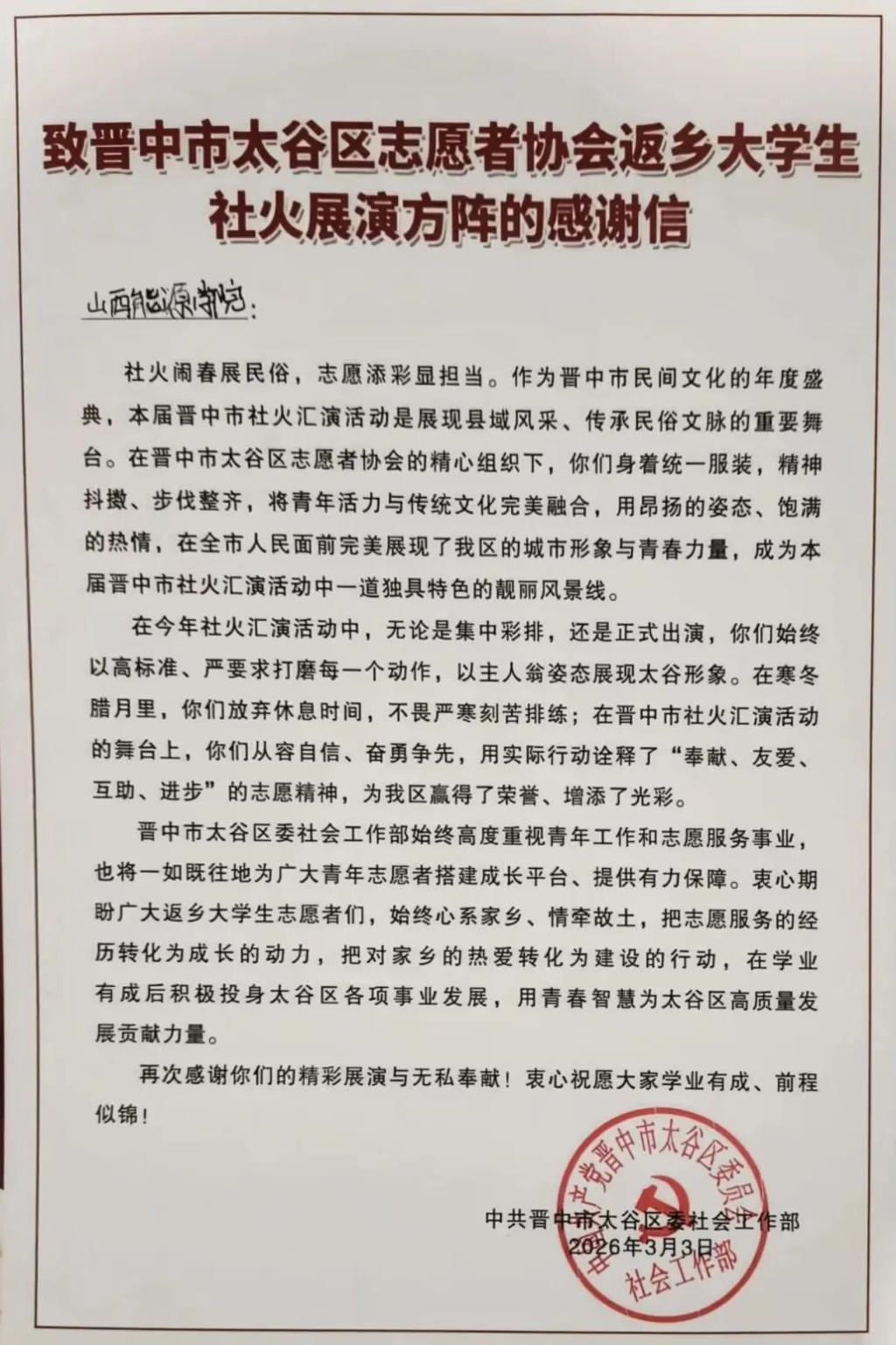 元宵佳节庆团圆,社火欢腾迎新春。2026年3月3日(正月十五),晋中市社火节热闹启幕,由晋中市太谷区志愿者协会组织的260名太谷籍返乡大学生志愿者代表团展演方阵惊艳亮相,以青春之姿为盛会添彩,用志愿力量彰显太谷风采。地质与测绘工程系资勘2401班团支部曹佳辉同学便是其中一员!