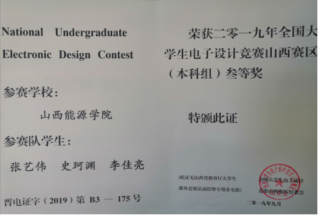 全国大学生电子设计竞赛从1997年开始每两年举办一届,2019年8月,恰逢两年一次的全国比赛,电气系电子科技制作协会派出参赛队,在电气系乔凌霄老师,蒋卫东老师,徐善智老师的指导下,于2019年8月7日-8月10日四天三夜参加比赛,8月15日在中北大学参加了综合评测,并取得了山西赛区(本科组)三等奖的优异成绩。