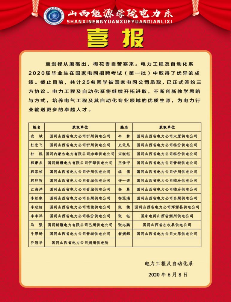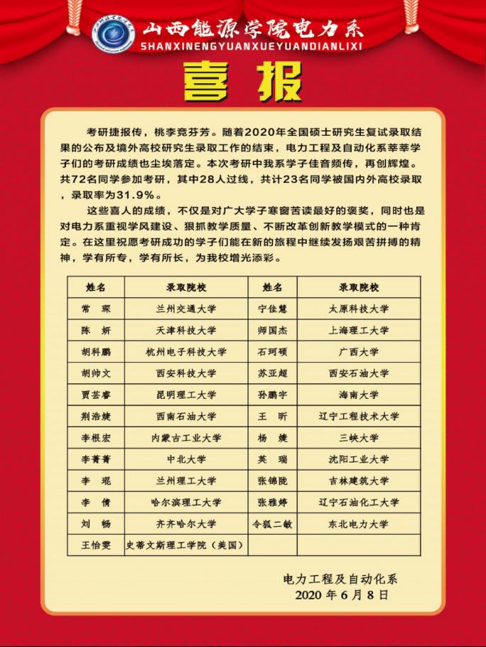 近年来,我院不断的提升教学水平、营造良好的学习氛围、培养学生内涵建设同时还不断地给予学生鼓励和支持。在2020年考研和国家电网招聘考试上我系学子取得如此优异成绩,不仅仅是学生多年来努力奋斗的成果,更离不开我系领导及老师们地付出与教导。