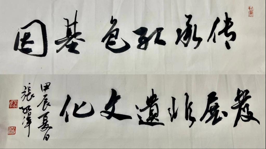 临别时,张红伟主席提笔赠予三下乡队伍一幅字,“传承红色基因,发展非遗文化”。