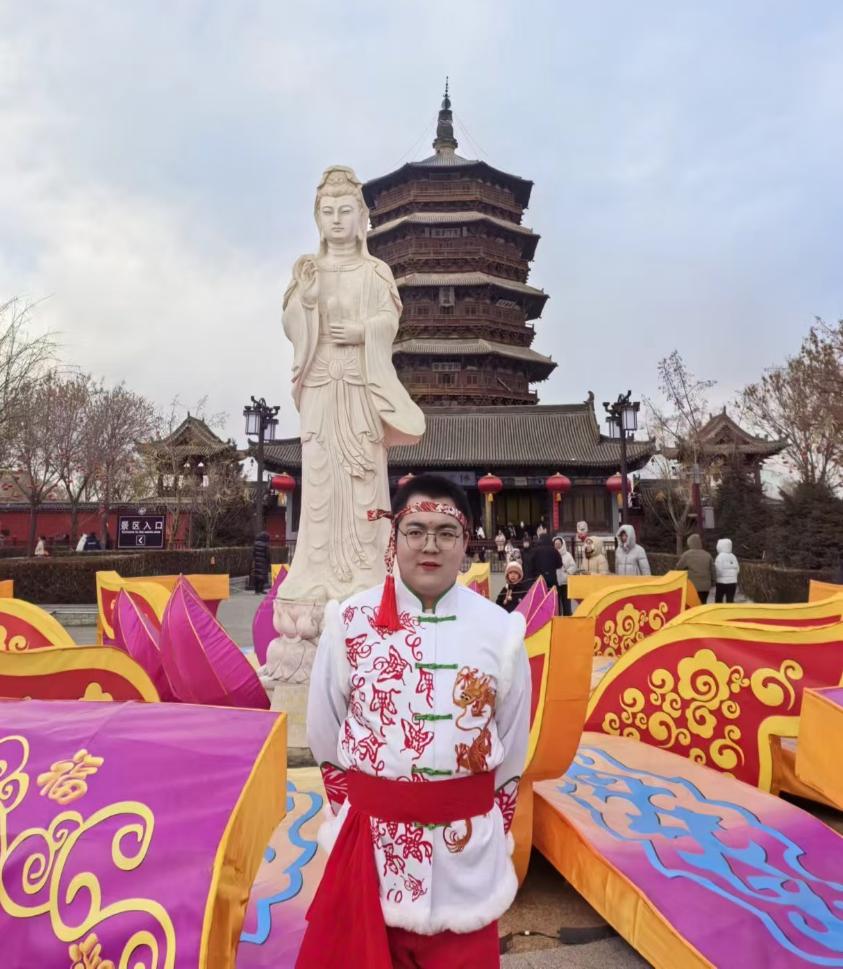暮色中的应县木塔在白雪映衬下巍然矗立,檐角悬满造型各异的花灯。一群身着绛红绸衣的大学生手持彩扇,踩着欢快的鼓点在千年古建前扭动秧歌。他们原本是参与社会实践的大学生,因人手不足被编入县城秧歌队此刻却成了连接古老技艺与新春气象的纽带——彩绸翻飞间,木塔的榫卯纹路与灯笼上的剪纸纹样在镜头里交织,年轻的面庞与沧桑的木构形成时空对话。当最后一盏鲤鱼灯亮起,整座塔院化作星河,新春的生机在千年梁柱间流淌不息。