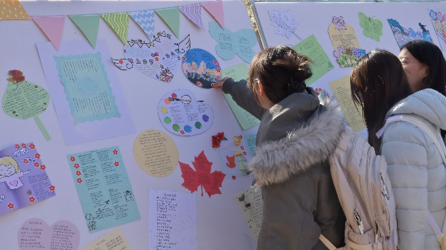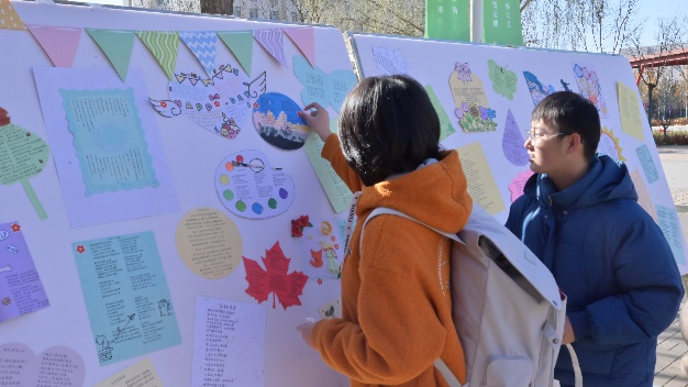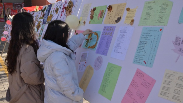 经过评审,一批优秀的“心笺寄语”作品脱颖而出,并于11月25日在能源食府门口进行了集中展览。通过后期的集中展示,让同学们感受到“你并不孤单”,在别人的诗行中找到共鸣,在缤纷的色彩中汲取力量。展览现场吸引了众多师生驻足观看,成为校园内一道独特的风景线。