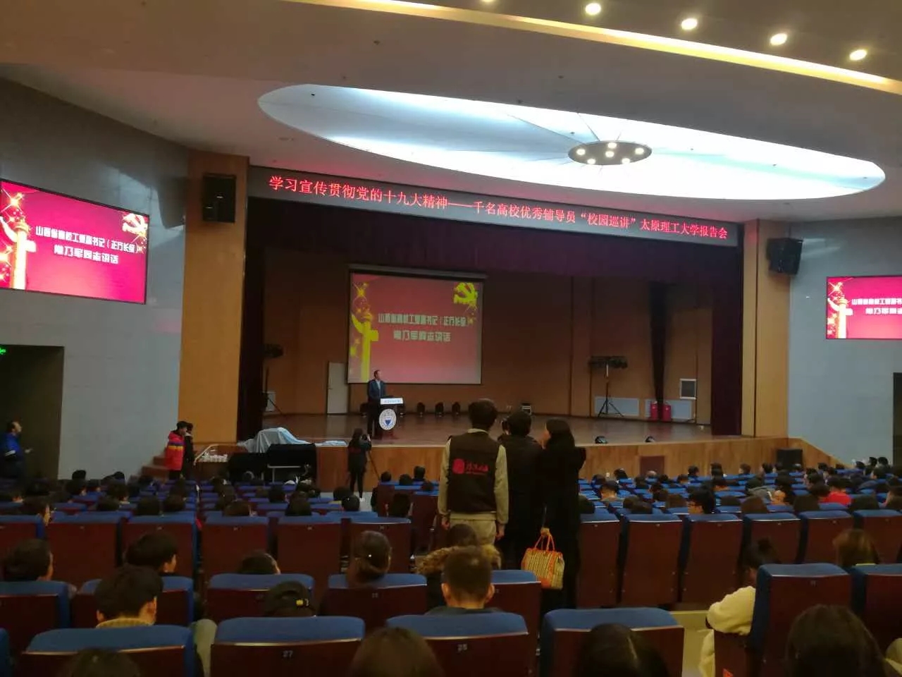 2017年11月25日上午,由教育部主办的“学习宣传贯彻党的十九大精神——千名高校优秀辅导员‘校园巡讲’和‘网络巡礼’”活动走进山西。来自高校新校区10所高校的700余名师生代表齐聚太原理工大学明向校区学生活动中心报告厅,认真聆听了这堂生动的报告会。我系党支部书记刘超群,辅导员贾文娟偕同十余名学生出席了本次报告会。