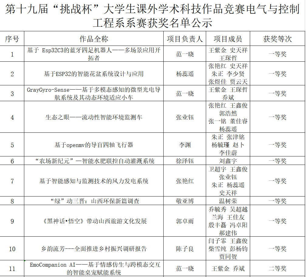 为深入贯彻落实党的二十大和二十届三中全会精神,深入实施科教兴国战略、人才强国战略、创新驱动发展战略,进一步引导学生努力培养科学精神和科学态度,电气与控制工程系“挑战杯”大学生课外学术科技作品竞赛落下帷幕。评委小组综合社会价值、实践过程、创新意义、发展前景与团结协作这几个要素,对各个项目做出了公平公正的评分,现将竞赛结果公示如下: