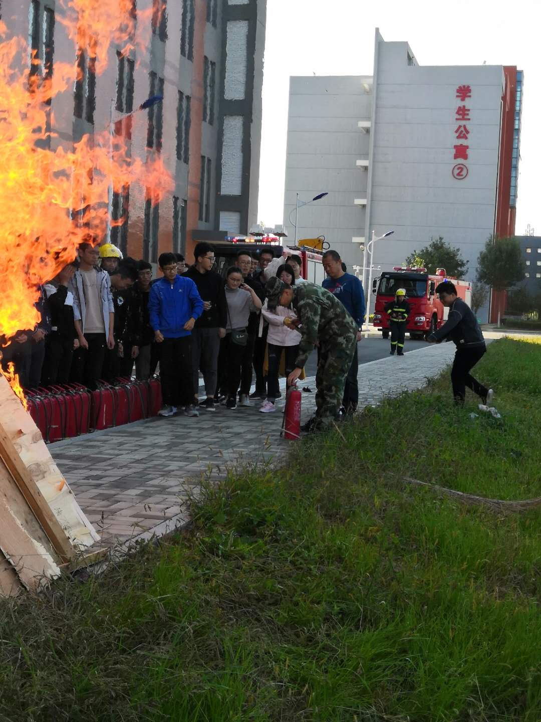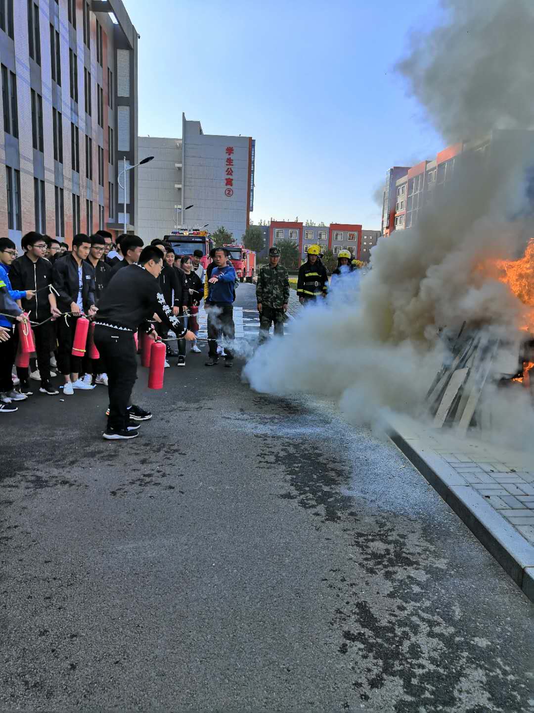 随后,进行了灭火实战演练。面对浓烟和烈焰,学生代表们轮流积极上前,在晋中市消防支队龙湖中队杜队长的指导下,使用灭火器进行了灭火实战演练。最后,杜队长对大家的疏散演练和灭火实战演练进行了点评:“今天同学们参演的热情十分高涨,说明同学们对消防安全是非常重视的,学校是人员密集场所,是我们防火工作的重点部位。尤其是学生宿舍,人员密集,用电设施多,大家平时一定要重视防火安全,用电安全,遇到险情,要用我们学到的疏散逃生自救知识,迅速撤离,比如在疏散的过程中一定要用湿毛巾捂住口鼻,并以低姿势前进,因为火场里的有毒烟雾是向上的,所以我们要避开有烟雾的侵害。灭火器的使用要注意首先拔掉铅封和保险销,一手压下压把,一手抓住软管对准火焰的根部,进行喷射灭火。室外人要在上风的方向喷射。”同学们对龙湖中队消防官兵的辛勤付出表示了真挚热烈的感谢。