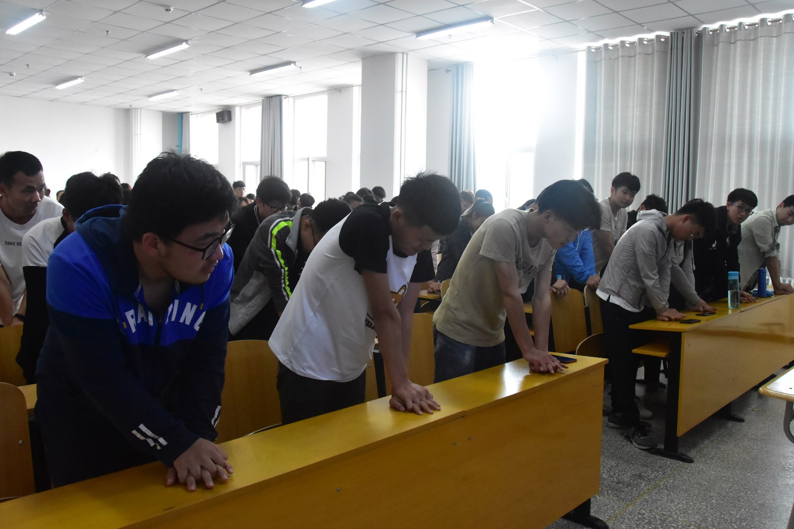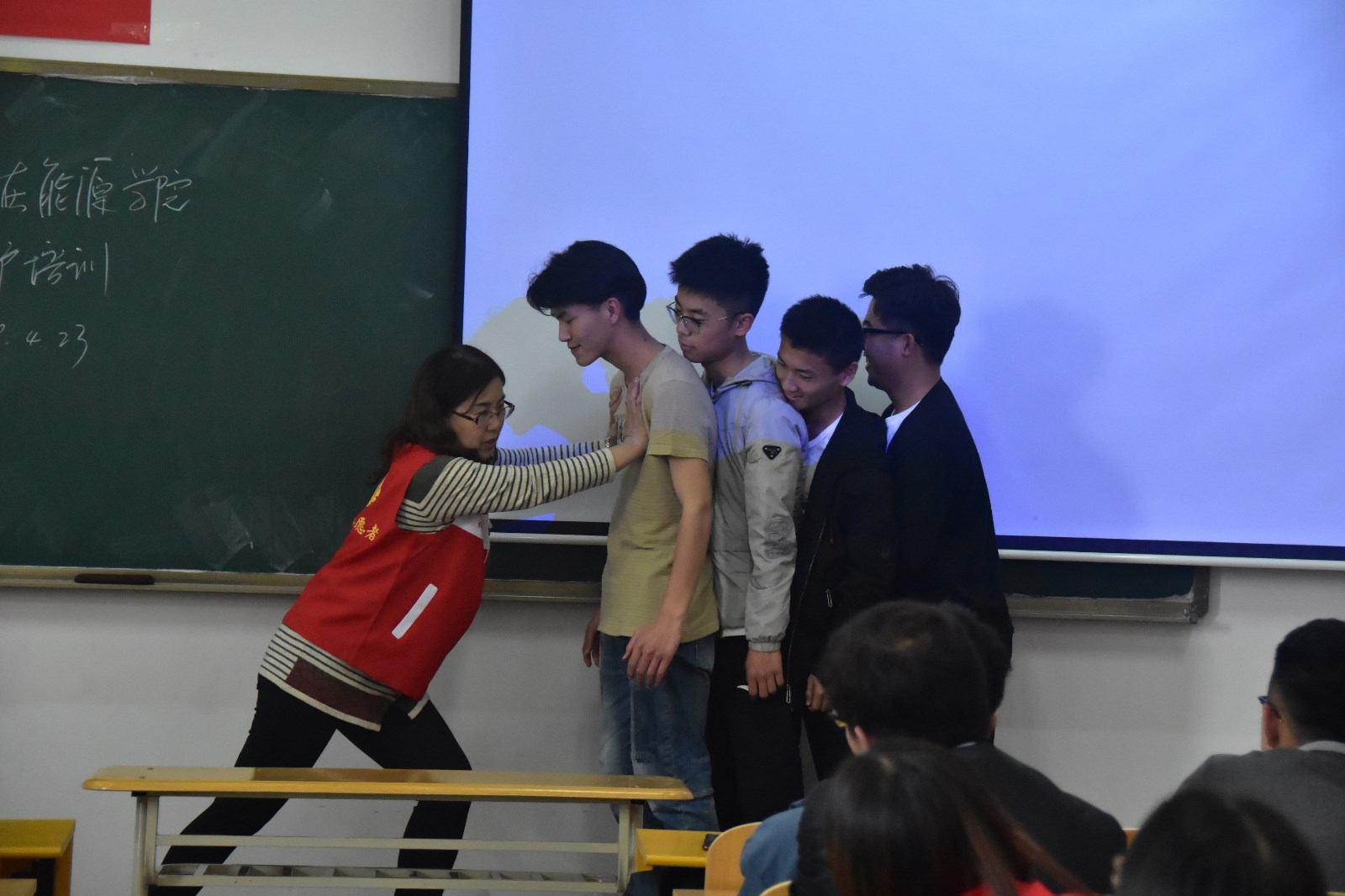 张老师生动的讲授了现代救护理念、急救的五个生存链、心肺复苏术、晕厥、创伤扭伤和骨折等常见突发伤害的基本知识和救护技能,以及遇到踩踏事件时如何自我保护。并通过常见突发事故现场图片,告诉同学们,在突发事件灾难现场如何冷静处置,如何把握好急救时的“钻石4分钟、白金10分钟”,使患者得到及时有效的救护。