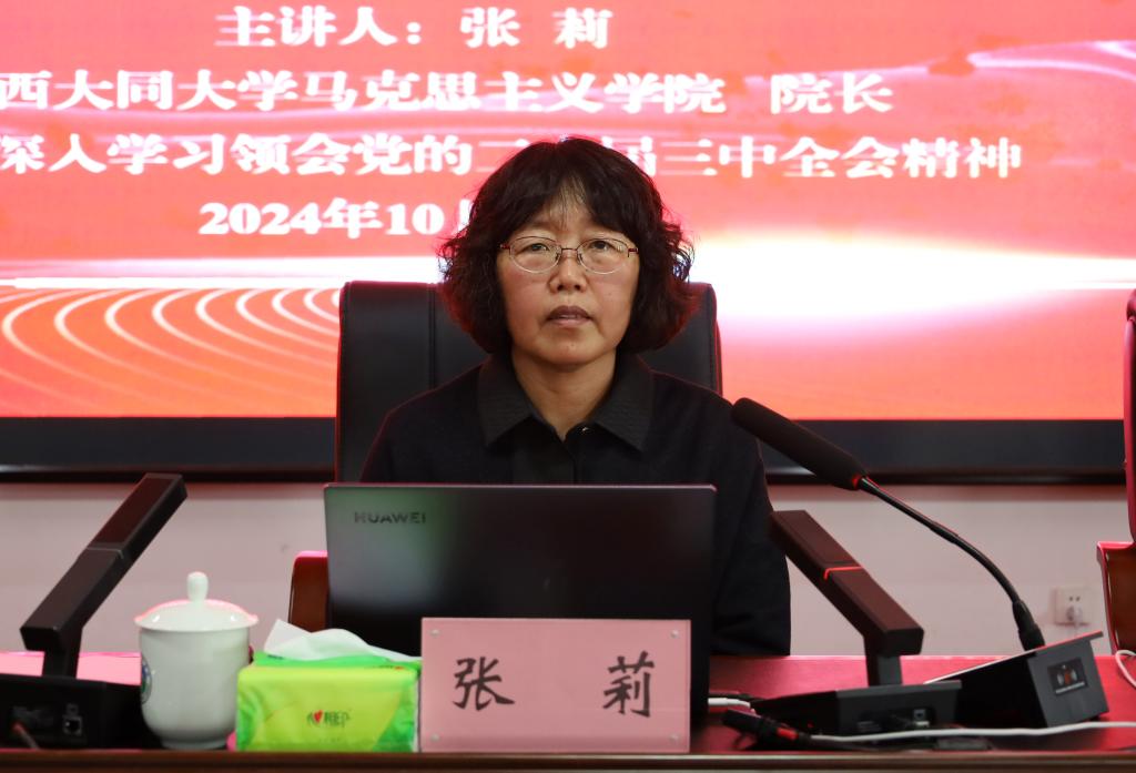 为全面深入学习领会党的二十届三中全会精神,引导全校师生把思想和行动统一到全会精神上来,按照省委讲师团《关于做好“百人百场报告会”进基层宣讲活动的通知》要求,10月29日,“百人百场报告会”进基层宣讲活动在世界杯官网笃学楼二层报告厅举办。山西省领导干部宣讲团成员、大同大学马克思主义学院 党委副书记 院长 张莉教授莅临世界杯官网作了题为《深入学习领会党的二十届三中全会精神》的专题宣讲。校党委副书记桑楠同志主持会议。在校领导班子、中层领导干部、思想政治理论课教师、组织员、辅导员、学生代表聆听宣讲会。