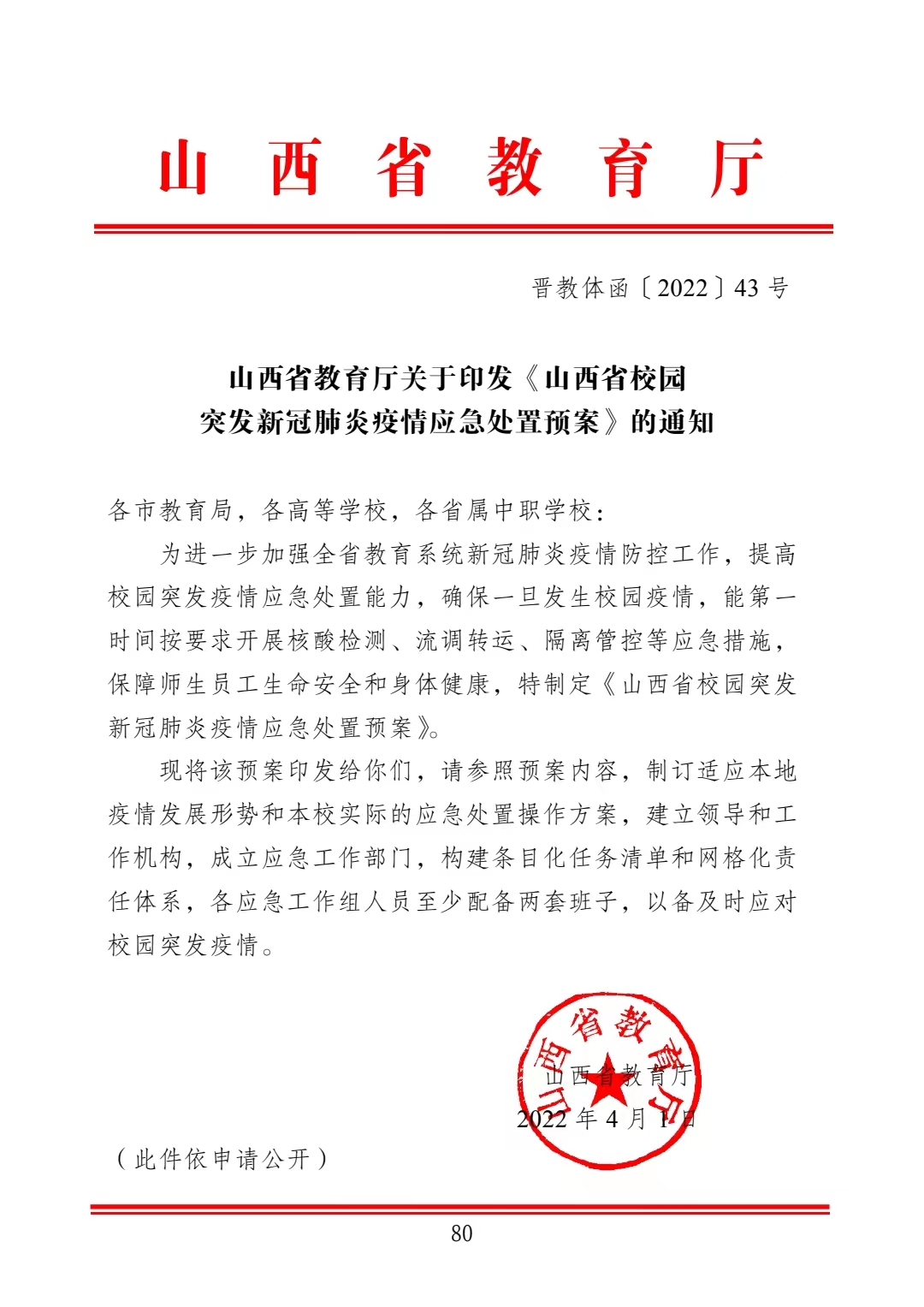 山西省教育厅关于印发《山西省校园突发新冠肺炎疫情应急处理预案》的通知