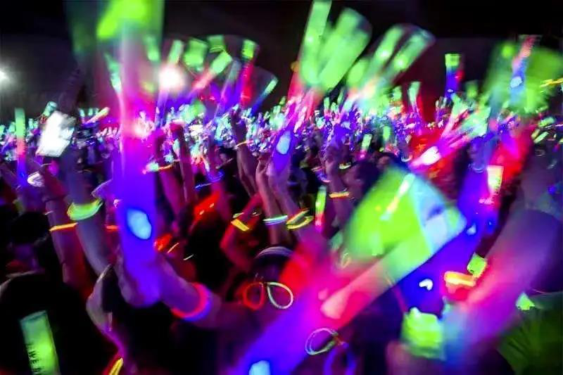 场地中央歌手献上了激情澎湃的音乐,领跑人员成为整个场地的焦点,紧跟他们的身后是绚烂的荧光,黑暗的天空仿佛都被映照成绚丽的彩色。