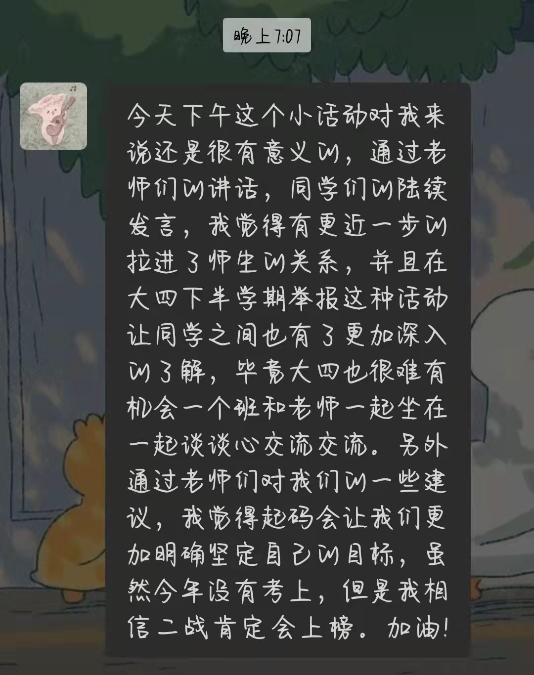 一语惊醒梦中人,接着同学们畅所欲言聊学习、聊考研、聊就业,聊未来,他们的情绪得到了释放,他们的心声我们听到了,他们的诉求有了回应,他们得到了进一步的关心,他们的脸上露出了开心的笑容……