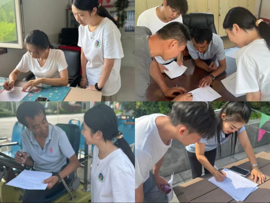 下山后,同学们携带石膏山景区自然生态调查问卷,在景区内与工作人员进行细致对接。他们走向景区工作人员、游客中心的管理员,礼貌递上问卷并清晰说明来意。工作人员接过问卷,趁着工作的间隙专注填写。队员们凝神倾听,若遇不解之处,便谦逊地俯身请教,偶尔还会拿出笔记本快速记下要点,生怕错过任何细节。整个过程高效而有序,山间不时回荡着他们与工作人员的交谈声,为这片绿意盎然的景区增添了几分青春的活力。
