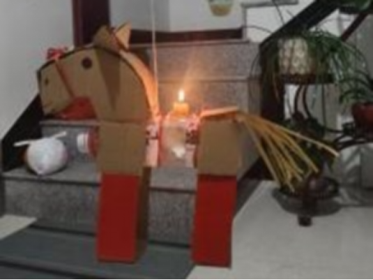 践行可持续设计理念,以快递盒、塑料瓶为核心材料,打造马年主题装置。通过手工重塑赋予废旧物料全新形态,结合烛光光影效果,让“环保小马”承载年味,在团圆之夜传递旧物新生的温暖与美好。我以指尖温度赋予其新生,只为等烛光亮起的刹那,让它驮着旧岁沉淀的微光,踏光而行,奔赴丙午马年的团圆良夜。