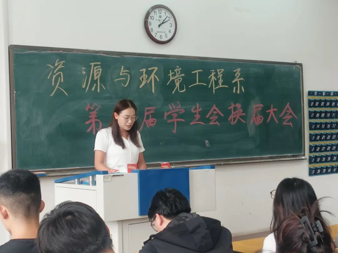 9月6日中午,资源与环境工程系学生会换届大会在综合楼110教室成功举办。资源与环境工程系党总支副书记任丽霞,团委学工办副主任李晓建,专职辅导员田晓晖以及学生会主席团各部门负责人共同参与了本次大会。