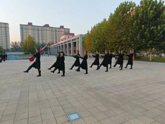 升国旗,奏国歌。全体师生行注目礼。五星红旗飘扬在学院南广场的上空,点燃了同学们那颗炽热的爱国之心。