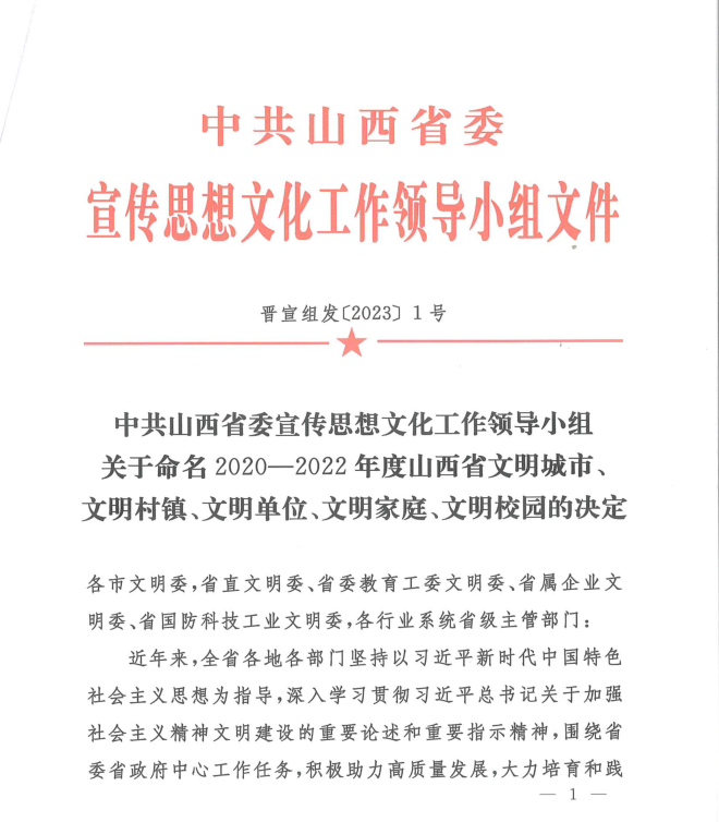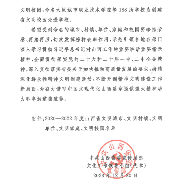 根据中共山西省委宣传思想文化工作领导小组印发的《关于命名2020-2022年度山西省文明城市、文明村镇、文明单位、文明家庭、文明校园的决定》,世界杯官网荣获2020—2022年度“山西省文明校园”称号。