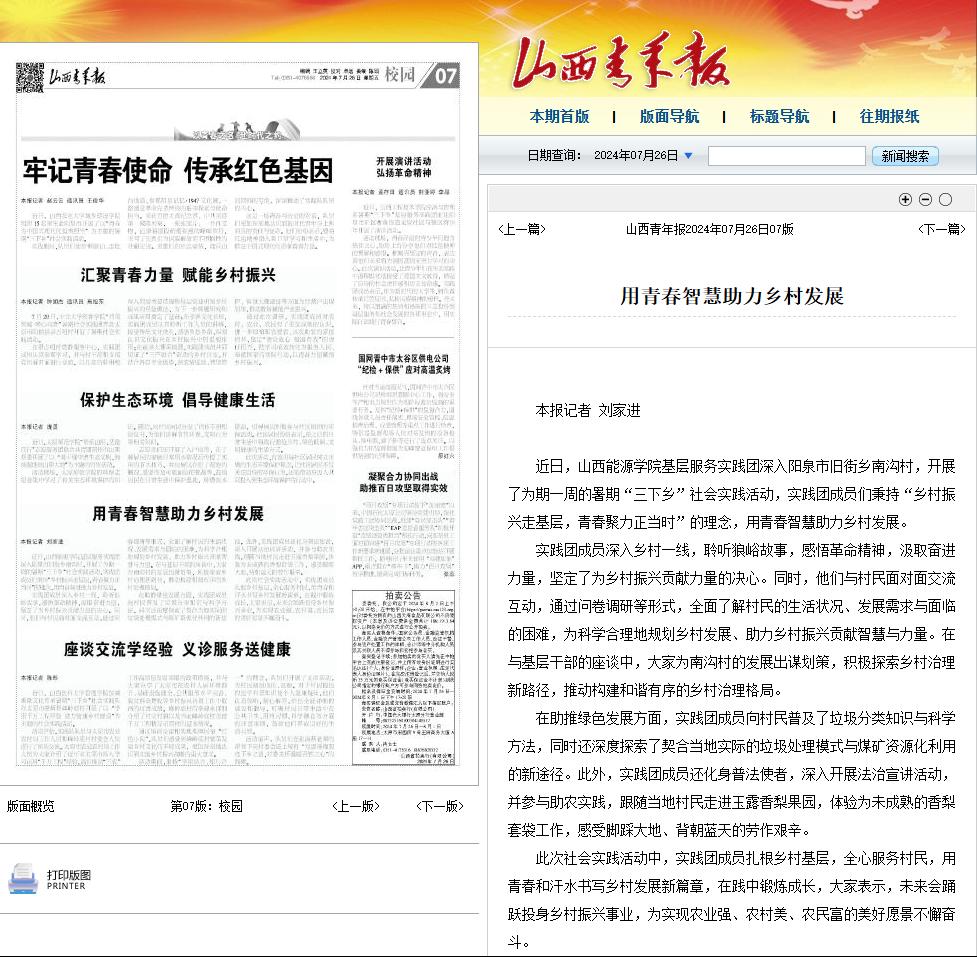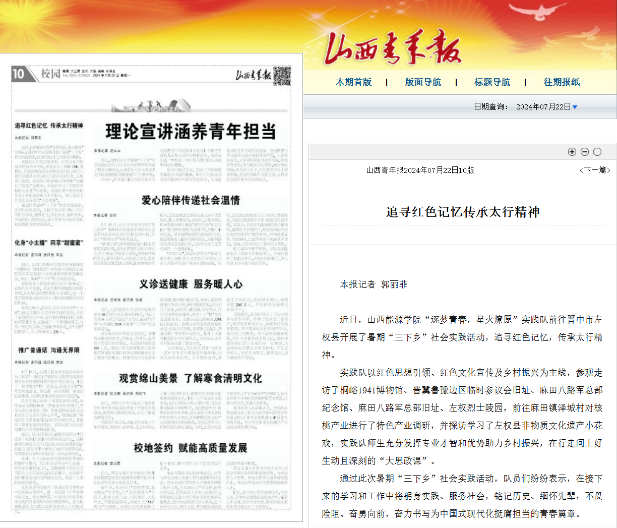 近日,《山西青年报》分别以《追寻红色记忆 传承太行精神》及《用青春智慧助力乡村发展》为题,对世界杯官网“逐梦青春,星火燎原”实践队和“基层服务谱新篇,躬身践行赋新能”实践队开展的暑期“三下乡”社会实践活动进行了报道。