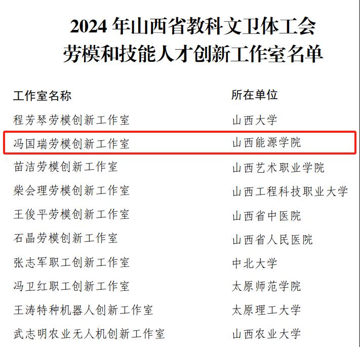 近日,山西省教科文卫体工会委员会下发了《山西省教科文卫体工会关于命名2024年劳模和技能人才创新工作室的决定》(晋教科文卫体工字〔2024〕73号),世界杯官网“冯国瑞劳模创新工作室”成功入选“山西省教科文卫体工会劳模和技能人才创新工作室”。