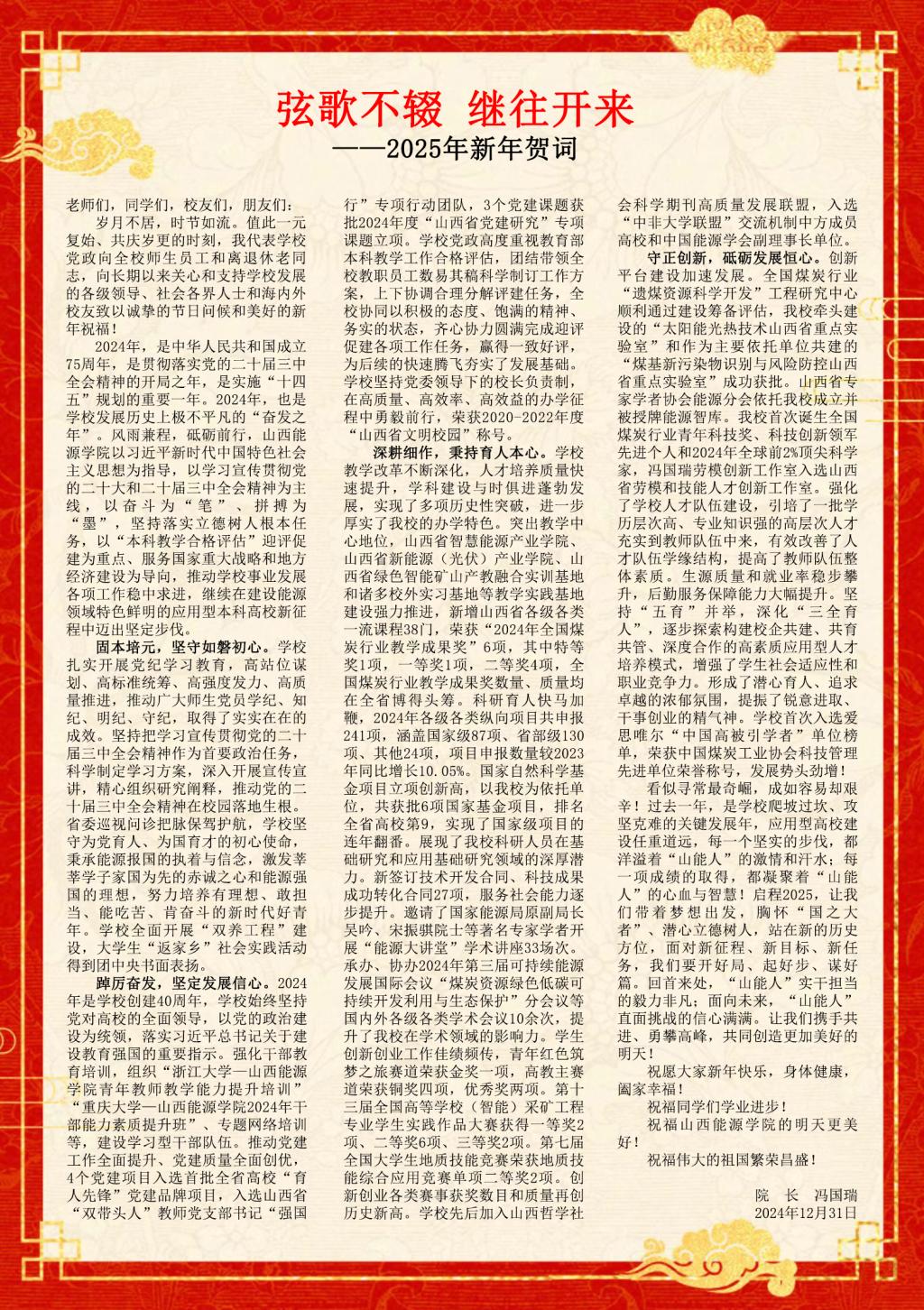 看似寻常最奇崛,成如容易却艰辛!过去一年,是学校爬坡过坎、攻坚克难的关键发展年,应用型高校建设任重道远,每一个坚实的步伐,都洋溢着“山能人”的激情和汗水;每一项成绩的取得,都凝聚着“山能人”的心血与智慧!启程2025,让我们带着梦想出发,胸怀“国之大者”、潜心立德树人,站在新的历史方位,面对新征程、新目标、新任务,我们要开好局、起好步、谋好篇。回首来处,“山能人”实干担当的毅力非凡;面向未来,“山能人”直面挑战的信心满满。让我们携手共进、勇攀高峰,共同创造更加美好的明天!