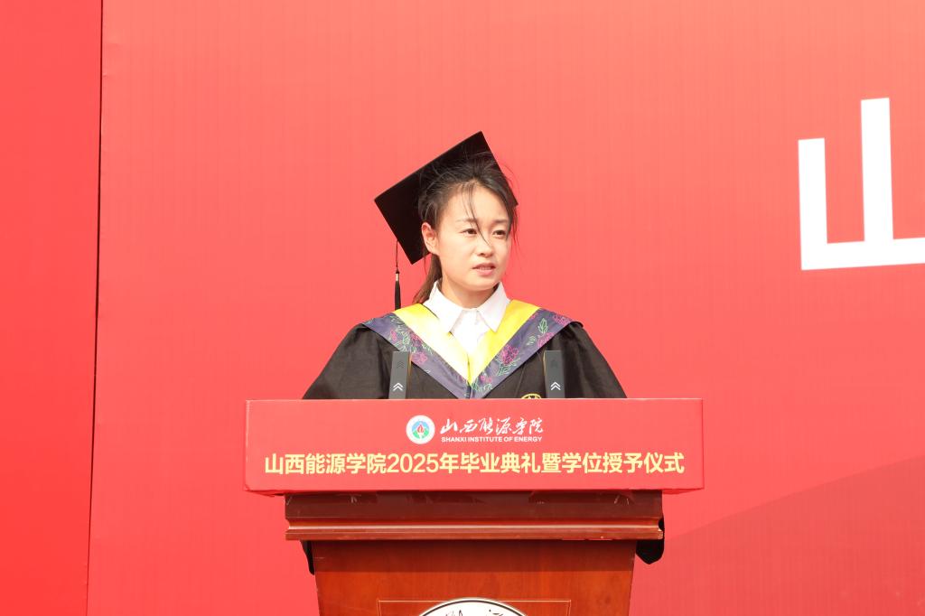 资源与环境工程系周婷作为学生代表发言。她结合四年来学校的发展与自身的成长经历,深刻阐释了对校训“立德强能 笃学善行”的理解。她表示,将铭记母校教诲,把个人理想融入民族复兴伟业。期待广大同窗也能让青春在保障国家能源安全、助力“双碳”目标的实践中绽放绚丽之花,为全面建设社会主义现代化国家贡献山能力量。