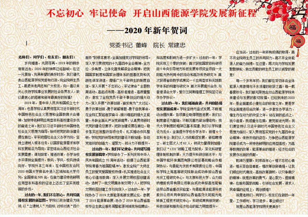 2019年,是中华人民共和国成立七十周年,也是学院认真贯彻落实习近平新时代中国特色社会主义思想和全国教育大会精神,加快特色鲜明应用型本科高校建设步伐的奋进之年。我们以习近平新时代中国特色社会主义思想为指导,始终把党的政治建设摆在首位,牢牢把握社会主义办学方向,坚持立德树人根本任务,以国家能源需求和学科发展前沿为导向,紧密结合山西经济社会发展需要,谋划探索,推进改革,办学治校水平得到全面提升,教风、学风、校风持续向好,学院升本三年来,在中国校友会网2020中国大学排名中进入区域知名大学行列,全国排名585名,在奋力建设特色鲜明应用型本科高校的征途上迈出了坚实而铿锵的步伐。