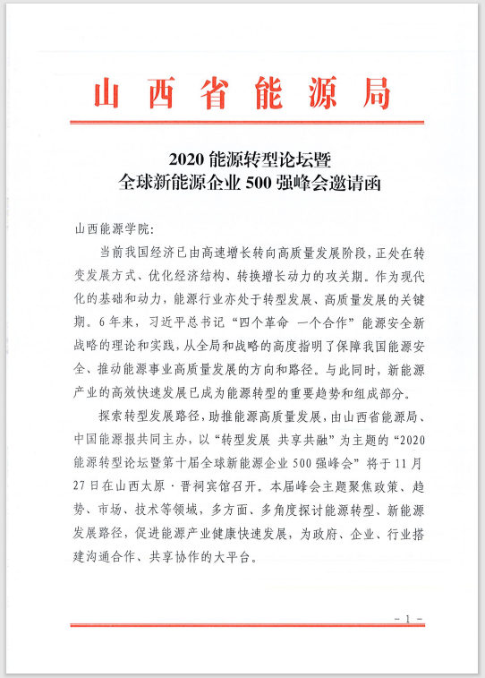 2020能源转型论坛暨第十届全球新能源企业500强峰会由山西省能源局、中国能源报联合主办,以“转型发展 共享共融”为主题,聚焦政策、趋势、市场、技术等领域,多方面多角度探讨能源转型、新能源发展路径,促进能源产业健康快速发展。