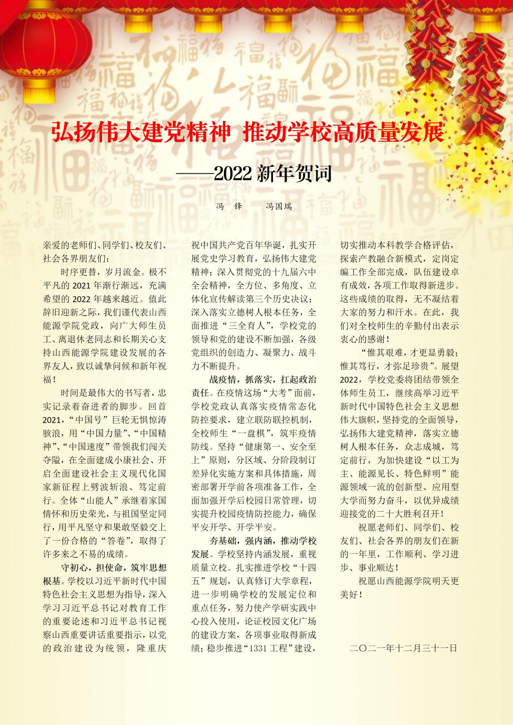“惟其艰难,才更显勇毅;惟其笃行,才弥足珍贵”。展望2022,学校党委将团结带领全体师生员工,继续高举习近平新时代中国特色社会主义思想伟大旗帜,坚持党的全面领导,弘扬伟大建党精神,落实立德树人根本任务,众志成城,笃定前行,为加快建设“以工为主、能源见长、特色鲜明”能源领域一流的创新型、应用型大学而努力奋斗,以优异成绩迎接党的二十大胜利召开!
