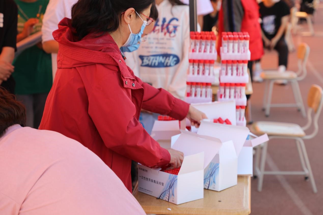 采样现场,值班老师、志愿者维护现场秩序,引导学生及教工人员戴好口罩、有序排队、保持距离。学生及教工人员积极配合工作,自觉佩戴口罩,按照系部分配的检测点分组排队检测,间隔一米,即采即走,秩序井然。