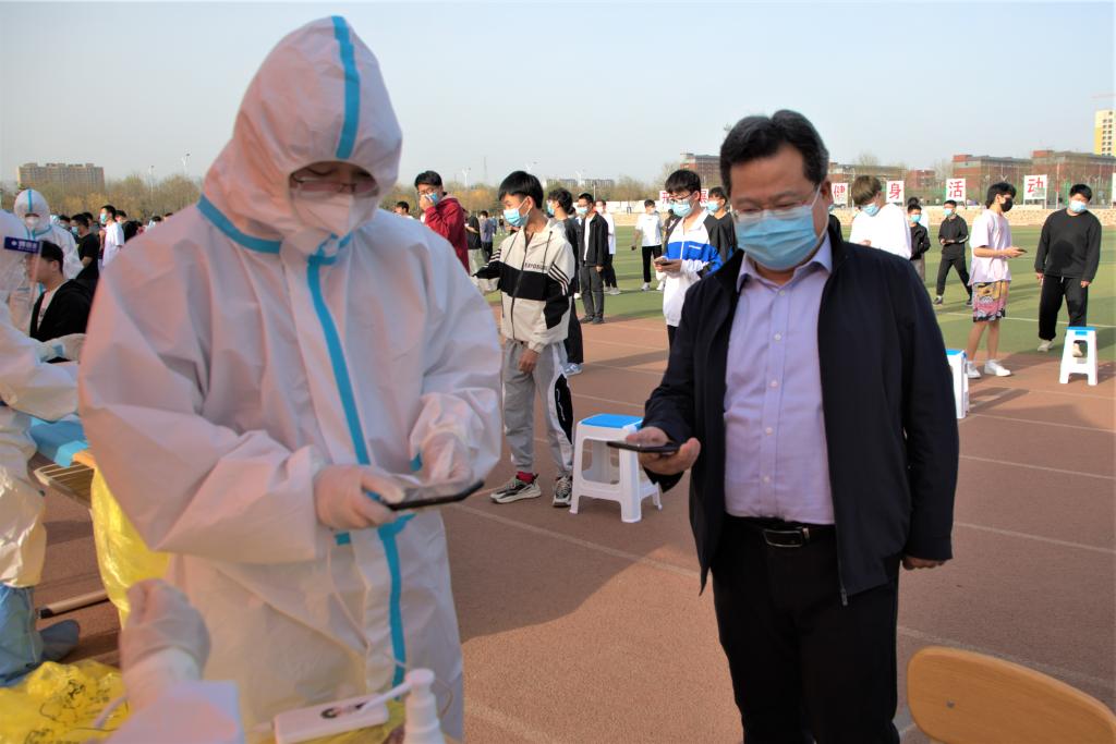 4月9日下午,冯国瑞副院长(主持行政工作)亲临现场指导世界杯官网第四次核酸采样工作,师生及工作人员有序到达检测点采样,完成咽拭子采样后有序离开,做到整个检测流程有条不紊。党委委员、副院长孙光辉也亲临现场。