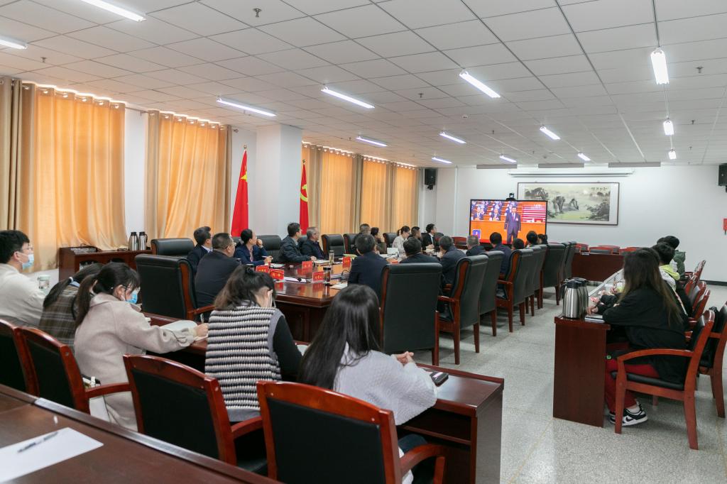 上午10时,学校党政领导、在校部门负责人代表、辅导员代表、学生代表在综合教学楼八层中会议室主会场进行了集中观看。