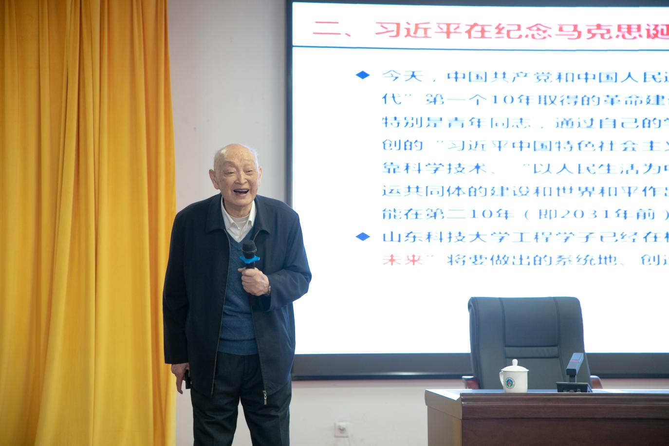 讲座上,宋振骐院士深情回顾了山东科技大学的建校历史和发展历程,动情讲述了自己早年艰辛的求学之路、当选院士后的科研点滴,勉励同学要珍惜韶华、奋发有为,以一往无前的奋斗姿态、风雨无阻的精神状态,建功新时代。