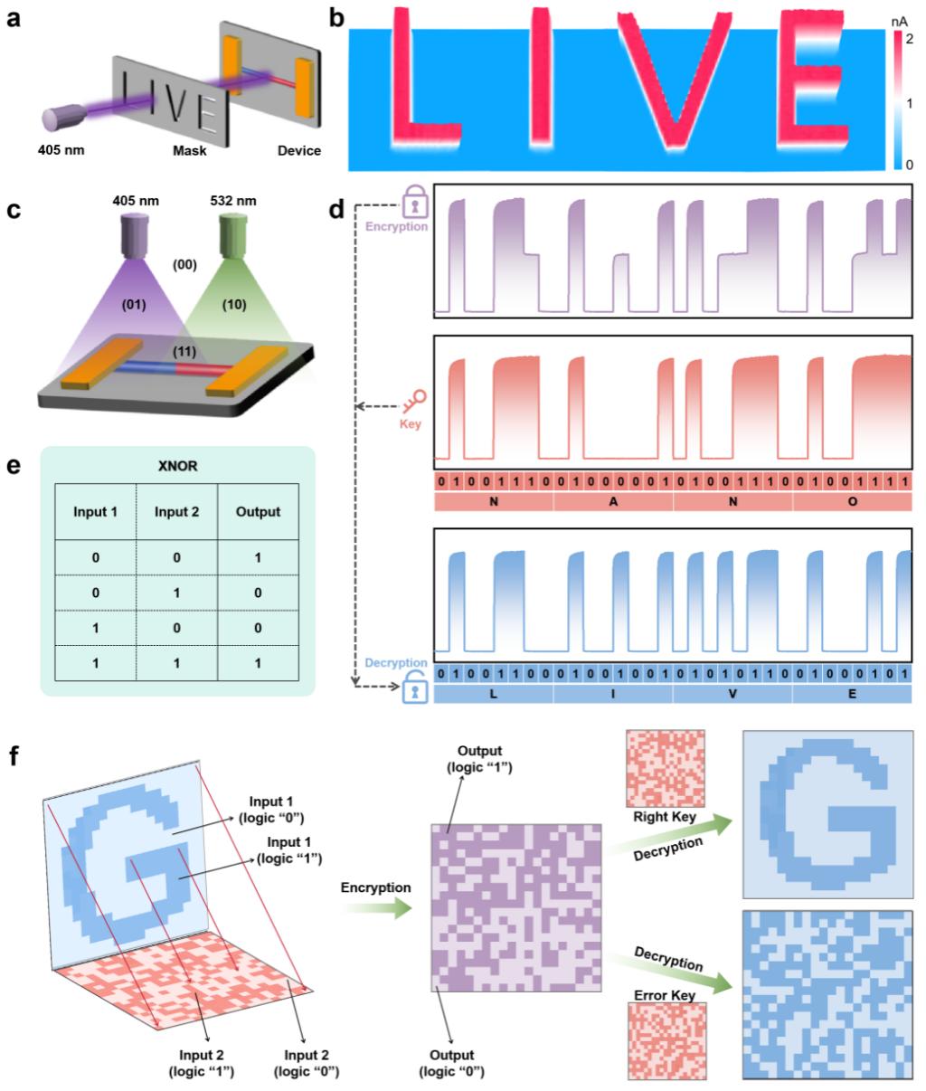 论文利用源移动化学气相沉积系统制备了一种全无机卤化物钙钛矿异质结纳米线。结果表明异质结纳米线光电探测器展现出显著的光电响应、响应度、开关比等方面的性能提升。同时鉴于在可见光波段的高光敏性,CsPbCl3/CsPbI3异质结纳米线光电探测器在图像传感及加密通信领域展现出巨大潜力。如图二所示为基于高性能光电探测器的高分辨率空间图像“LIVE”与双通道光加密通信应用研究,有利保障信息的安全传输。该研究工作为研究钙钛矿异质结构中载流子的传输特性提供了材料平台,在新一代高性能集成光子器件中具有潜在的应用价值。同时,以激光作为光信号和数据信息媒介,大幅提升信息的保密性和安全性,对推动光子通信及信息全光处理等领域的发展具有重要意义。