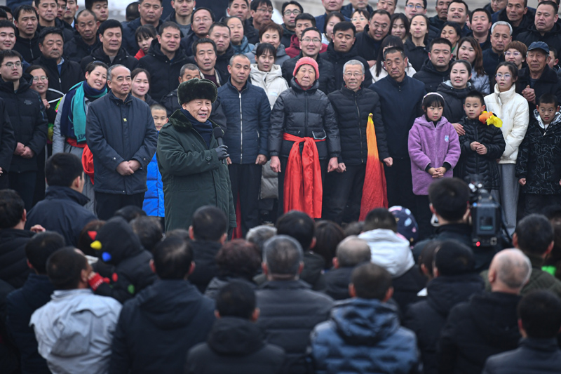 1月26日至27日,中共中央总书记、国家主席、中央军委主席习近平来到山西,看望慰问基层干部群众。这是26日下午,习近平在临汾市汾西县僧念镇段村文化广场,给乡亲们拜年,向全国各族人民、向港澳台同胞和海外侨胞致以美好的新春祝福。新华社记者 燕雁 摄