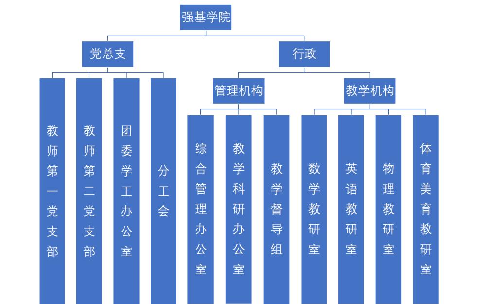 强基学院设四个党总支机构、三个管理机构和四个教学机构。中层领导4人、科级干部2人、教研室主任4人。同时,设有学生体质健康实验室、数学建模实验室、物理实验室、语音室。