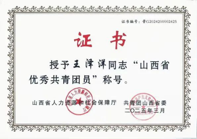 近日,共青团山西省委公布了“山西省五四红旗团委、山西省五四红旗团支部、山西省优秀共青团员、山西省优秀共青团干部”评选表彰名单,机械2101班学生王泽洋被授予“山西省优秀共青团员”荣誉称号。