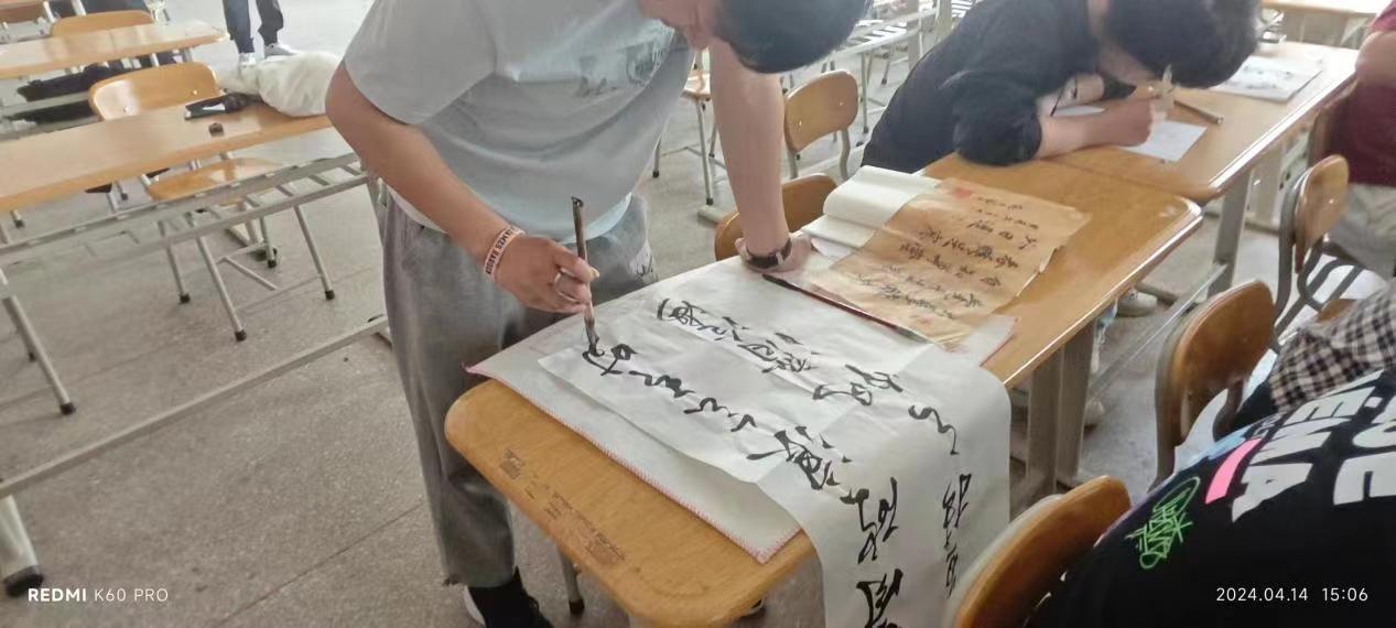 教室布置得古朴典雅,充满了书香气息。参赛同学们精神饱满,热情高涨,纷纷拿出自己的看家本领,用毛笔在纸上书写经典诗文。他们的字迹或清秀飘逸,或刚劲有力,每一笔、每一划都凝聚着对书法艺术的热爱与追求。