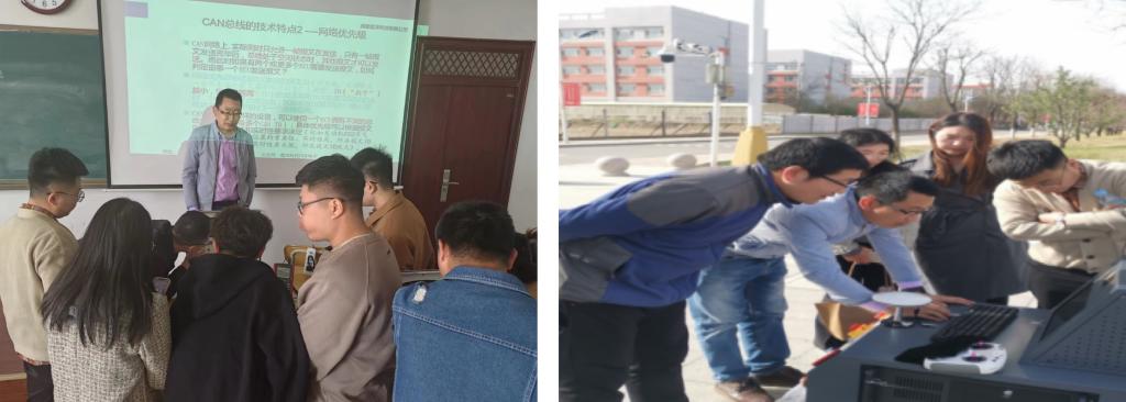 4月18日-19日,由中汽智联技术有限公司对基于CAIE-WCC001线控底盘的智能驾驶平台进行了调试与培训。培训内容有线控底盘的状态、电气接口说明、WFLY遥控说明以及通过CAN接口对车体进行指令控制以及线控使能控制说明;同时对底盘控制软件进行了相关介绍,包含底盘控制板块、档位控制板块、底盘数据板块等。最后根据编写的线控底盘控制程序,在学校南广场实现线控底盘的自动驾驶,其中包括直线驾驶、直角弯行驶、转圈行驶、S弯行驶、8字绕行行驶等。