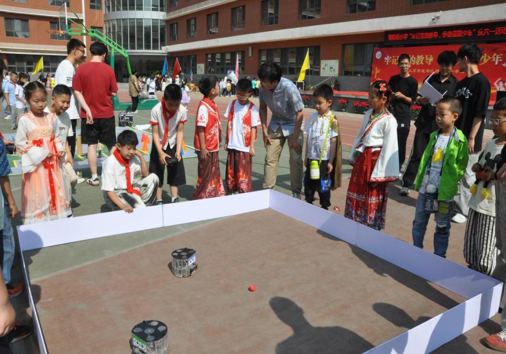 "哇!它会跳舞!""快看,那个机器人会翻跟头!"。活动现场,孩子们此起彼伏的惊叹声汇成了一曲科技交响乐。机器人创新中心指导教师许成浩老师用生动有趣的语言,将复杂的机器人知识变成了孩子们听得懂的"科技童话"。随后,成员们演示了机器人敏捷的动作和精准的操作,牢牢抓住了孩子们的目光。最受欢迎的环节当属"我是小小工程师",在大哥哥大姐姐的指导下,孩子们兴奋地尝试操控小型机器人完成一些动作指令任务,近距离感受科技的奇妙魅力,体验了一把当"机器人指挥官"的感觉。整个操场气氛活跃,孩子们争先恐后提问,眼中闪烁着好奇与探索的光芒。