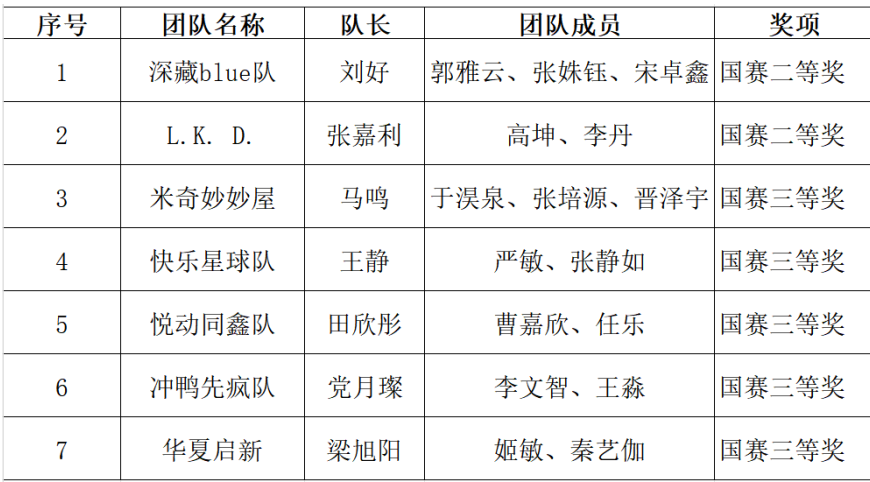 本次参赛我系参赛队伍从全国千余支队伍中脱颖而出,荣获国家级二等奖两项,三等奖五项,创历史最佳成绩。获奖名单如下: