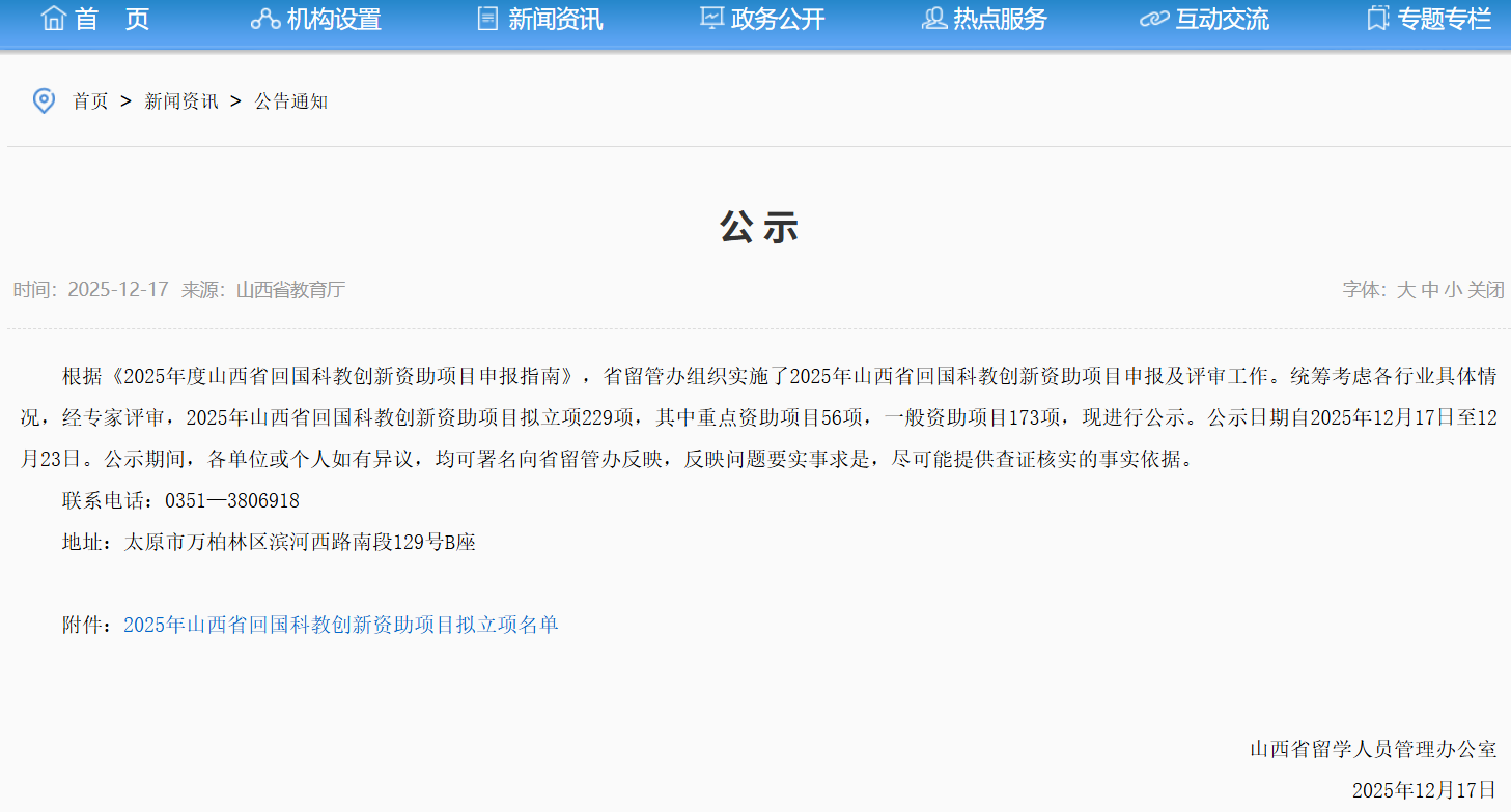 12月17日,山西省留学人员管理办公室对“2025年山西省回国科教创新资助项目拟立项名单”进行了公示,经济系王一然老师申报的项目成功入选。