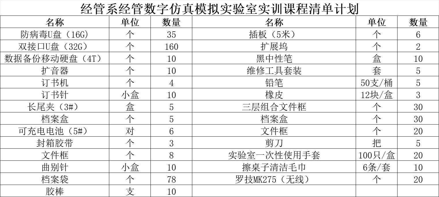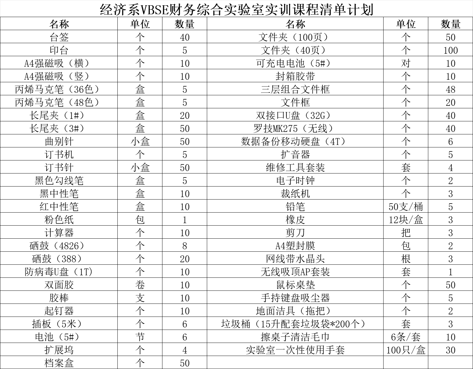 因我系实验实训教学工作需要,VBSE财务综合实验室、ERP沙盘模拟综合实验室、经管数字仿真模拟实验室三个实验实训室需采购2024-2025学年实验实训课程耗材。按照学校采购项目程序,现进行公开采购。