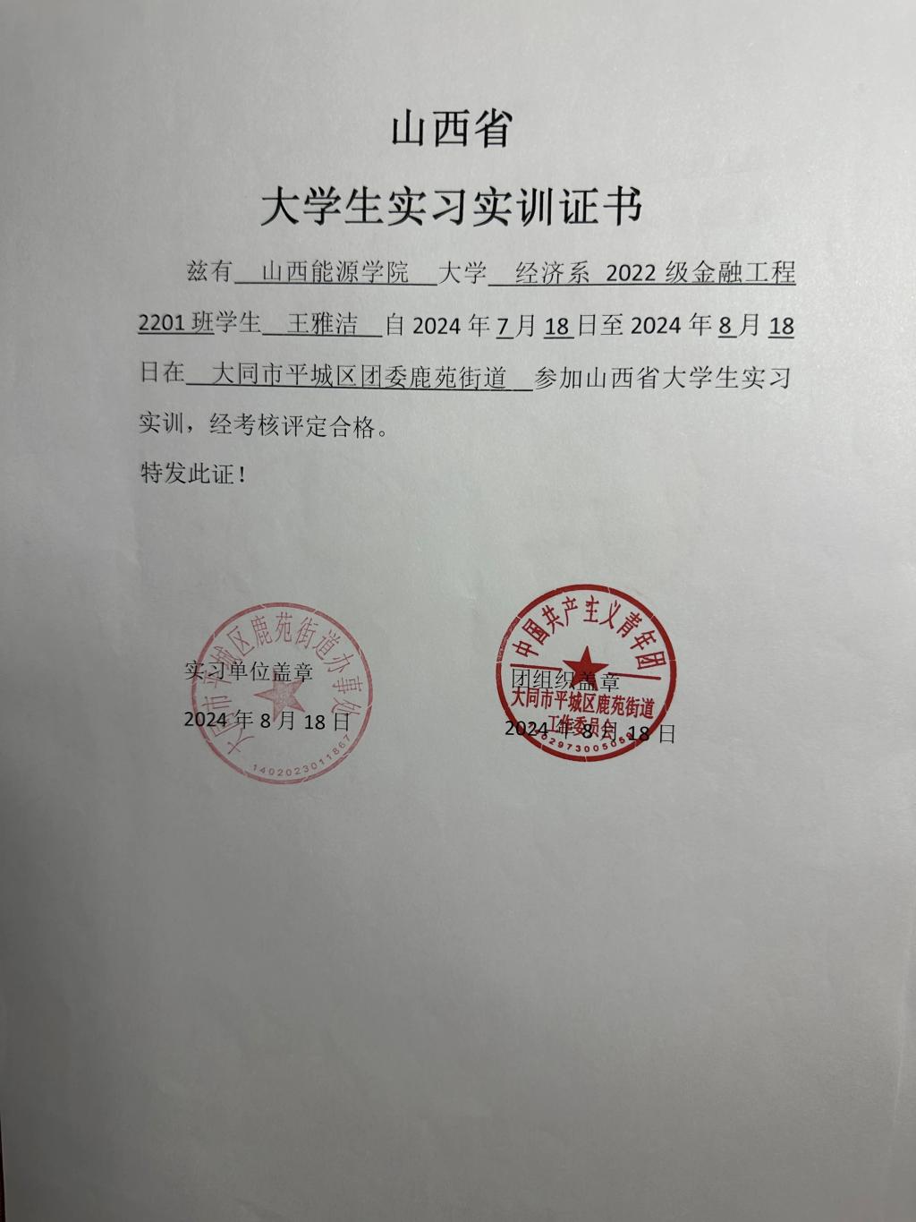 金融2201班王雅洁先后在党建办公室及退役军人服务站实习实训,在党建办公室整理资料,协助做表,文字记录,做活动总结,工作总结。