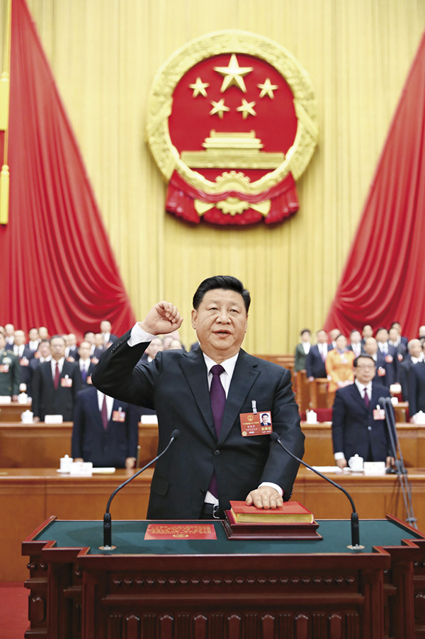 2018年3月17日,十三届全国人大一次会议在北京人民大会堂举行第五次全体会议。习近平当选中华人民共和国主席、中华人民共和国中央军事委员会主席。这是习近平进行宪法宣誓。 新华社记者 鞠鹏/摄
