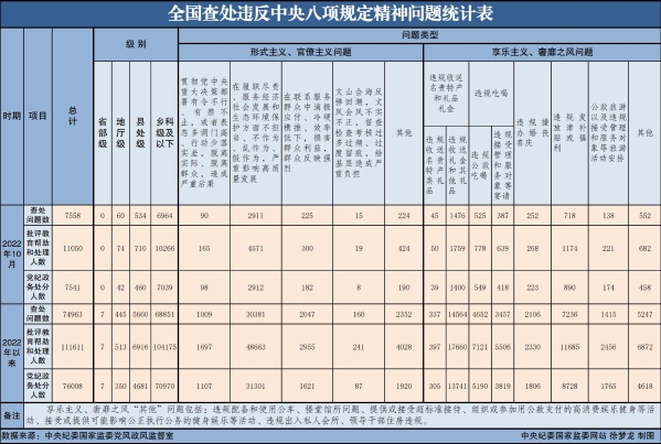 11月27日,中央纪委国家监委公布了2022年10月全国查处违反中央八项规定精神问题汇总情况。今年10月,全国共查处违反中央八项规定精神问题7558起,批评教育帮助和处理11050人,其中,党纪政务处分7541人,这是连续第110个月公布月报数据。